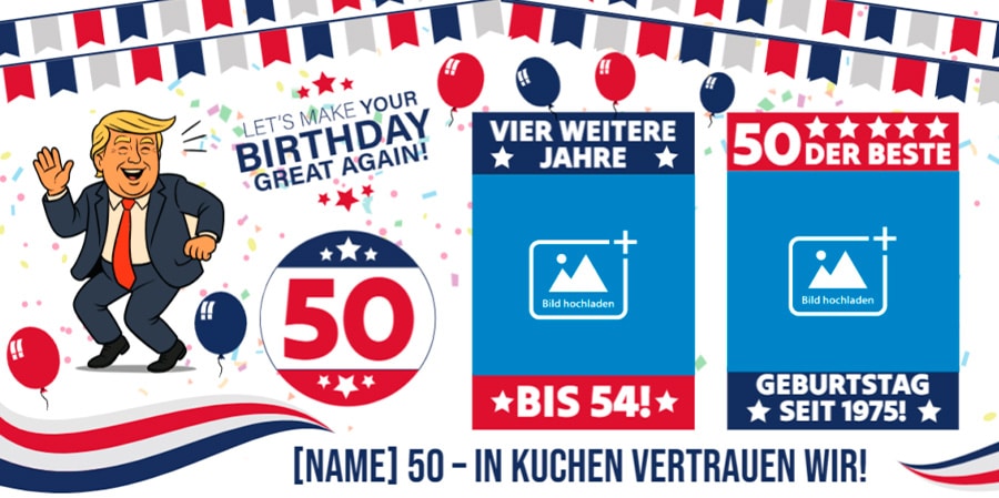 „Make Your 50th Birthday Great Again!“ Dieser Banner im amerikanischen Kampagnen-Style bringt politischen Humor auf die Geburtstagsfeier. Mit patriotischen Farben, Sternen und dem typischen Trump-Look wird der 50. Geburtstag zur großartigen Show.